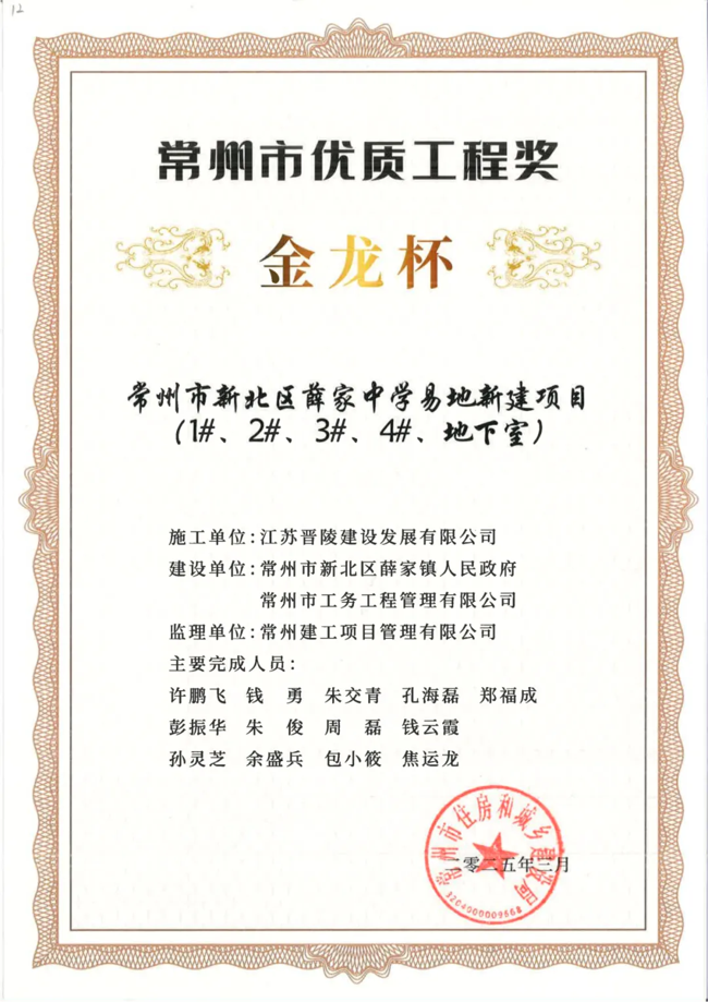 近日,常州市住房和城乡建设局公布了2023年度常州市“金龙杯”优质工程项目名单。晋陵集团下属江苏晋陵建设发展有限公司承建的薛家中学、卜弋花园、新尚嘉园等6个项目榜上有名,涵盖办公室大楼、学校、住宅等多类型建筑。
