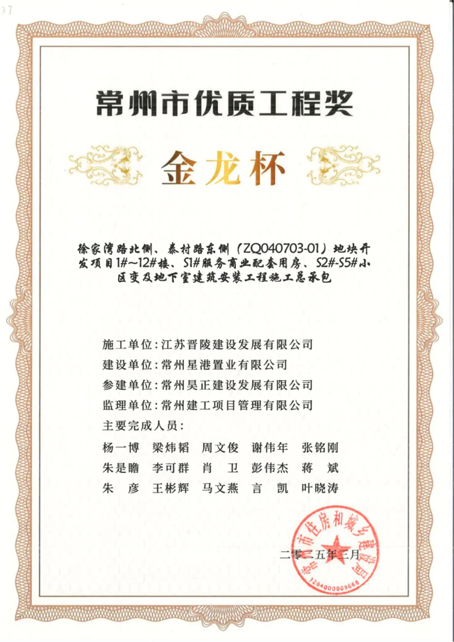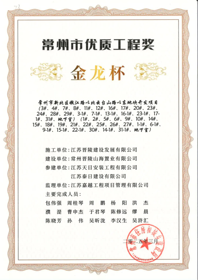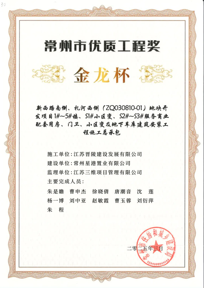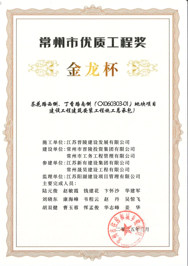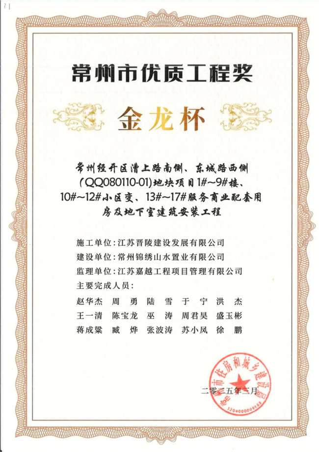 质量是工程建设的生命线,常州市优质工程奖“金龙杯”是常州市建设工程质量奖项的最高奖。晋陵建设始终秉持“匠心晋陵、品质建设”理念,坚持以创优为抓手,严格执行标准化施工流程,实施全过程质量监控,持续夯实安全生产责任,不断提升工程建设的品质与水平。截止目前,晋陵建设累计获得18项常州市优质工程奖“金龙杯”,充分展现了公司在建筑施工领域的管理水平和综合实力。